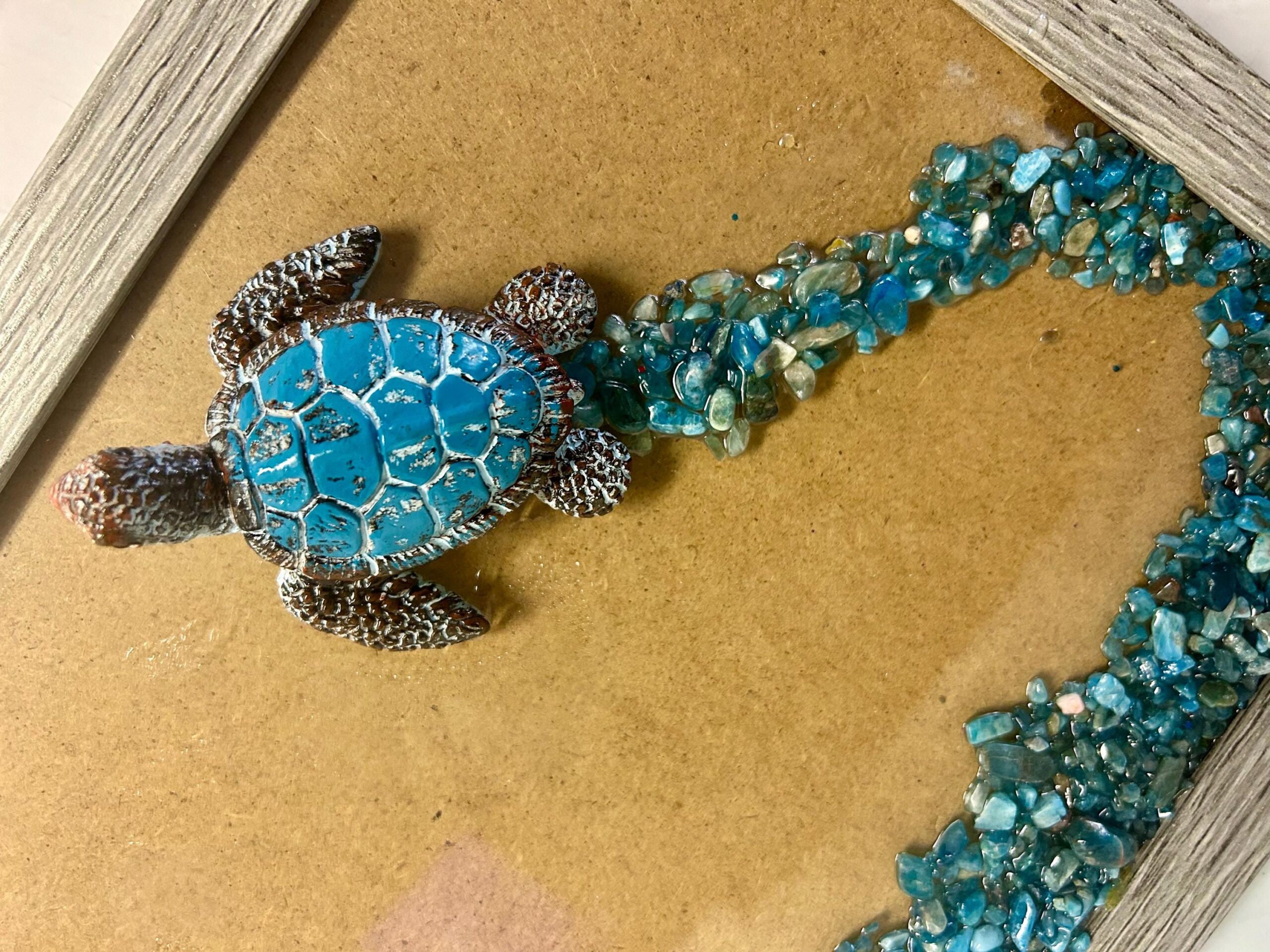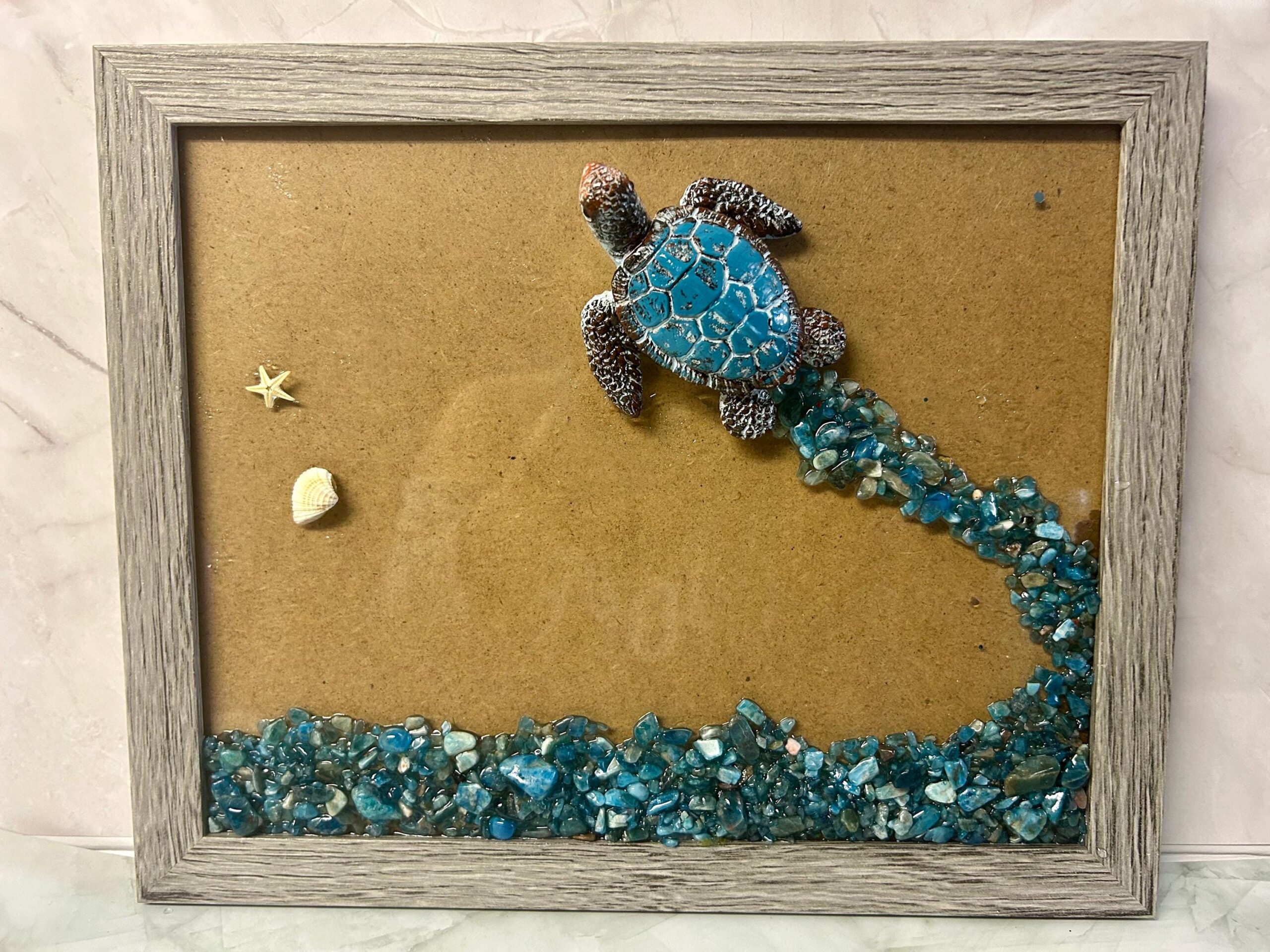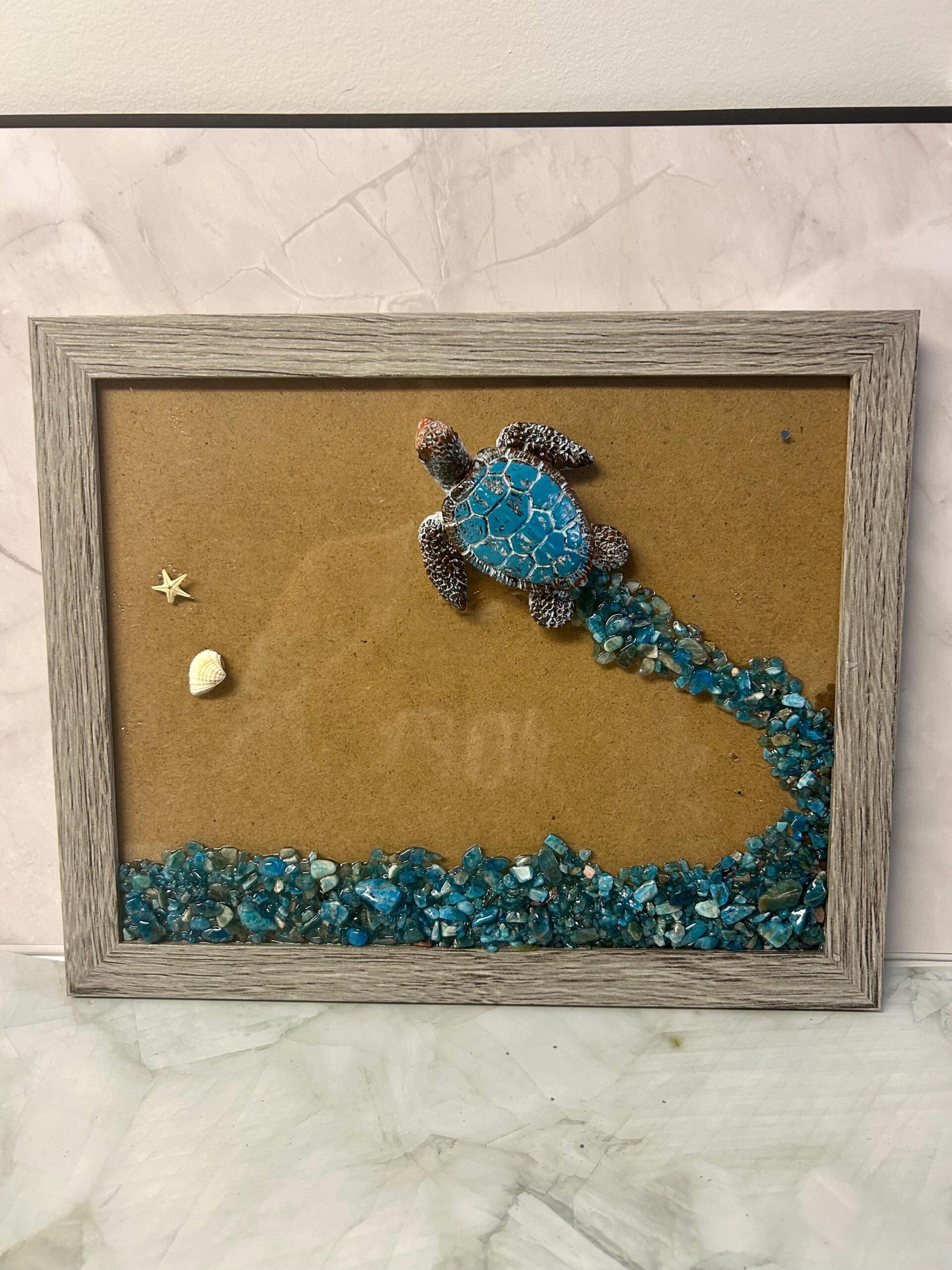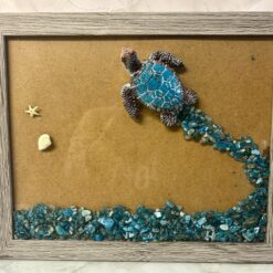 Be the first to review “8×10 sea turtle in frame blue stones white shells grey frame”