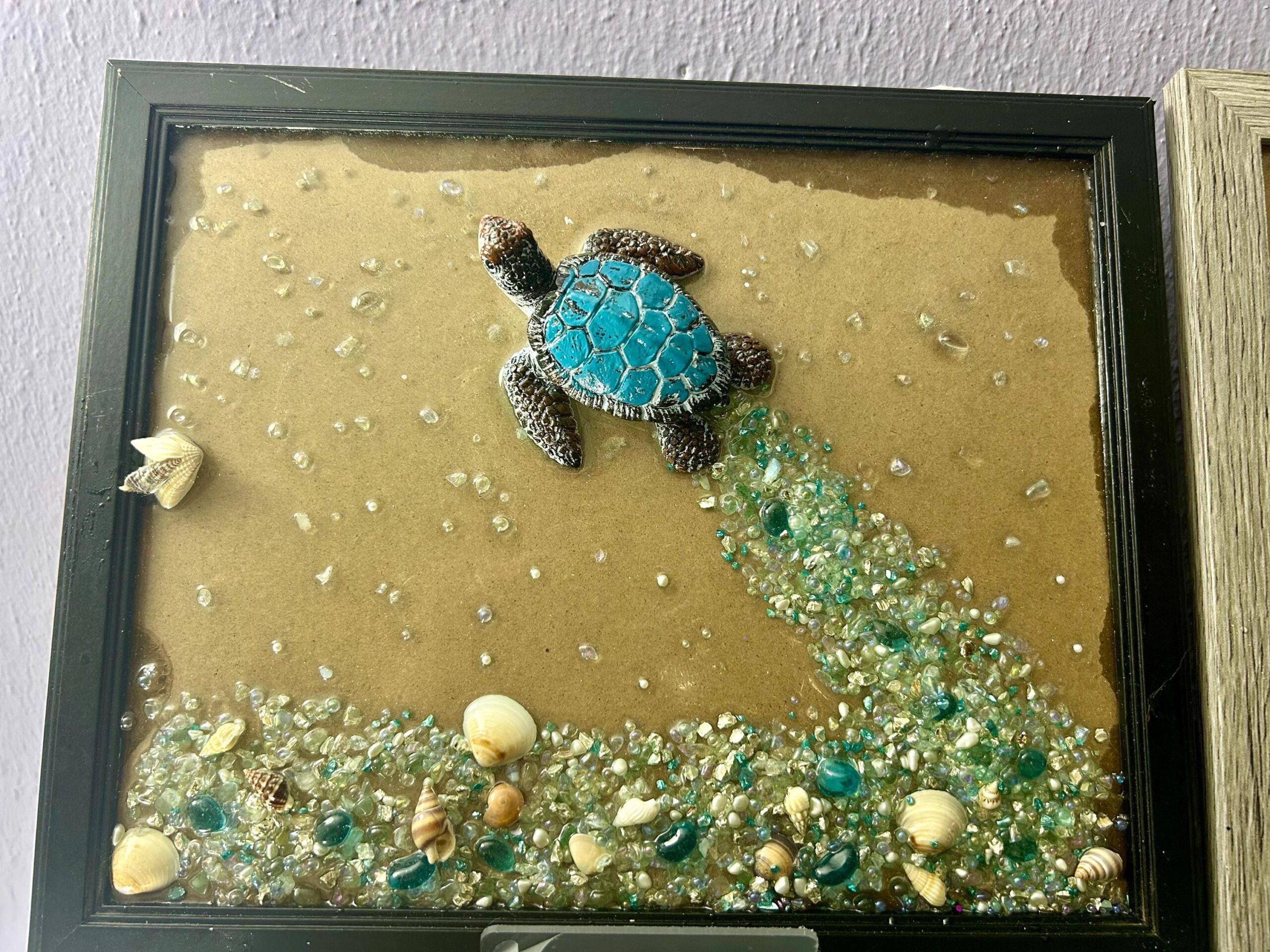 8×10 sea turtle in frame blue stones white shells