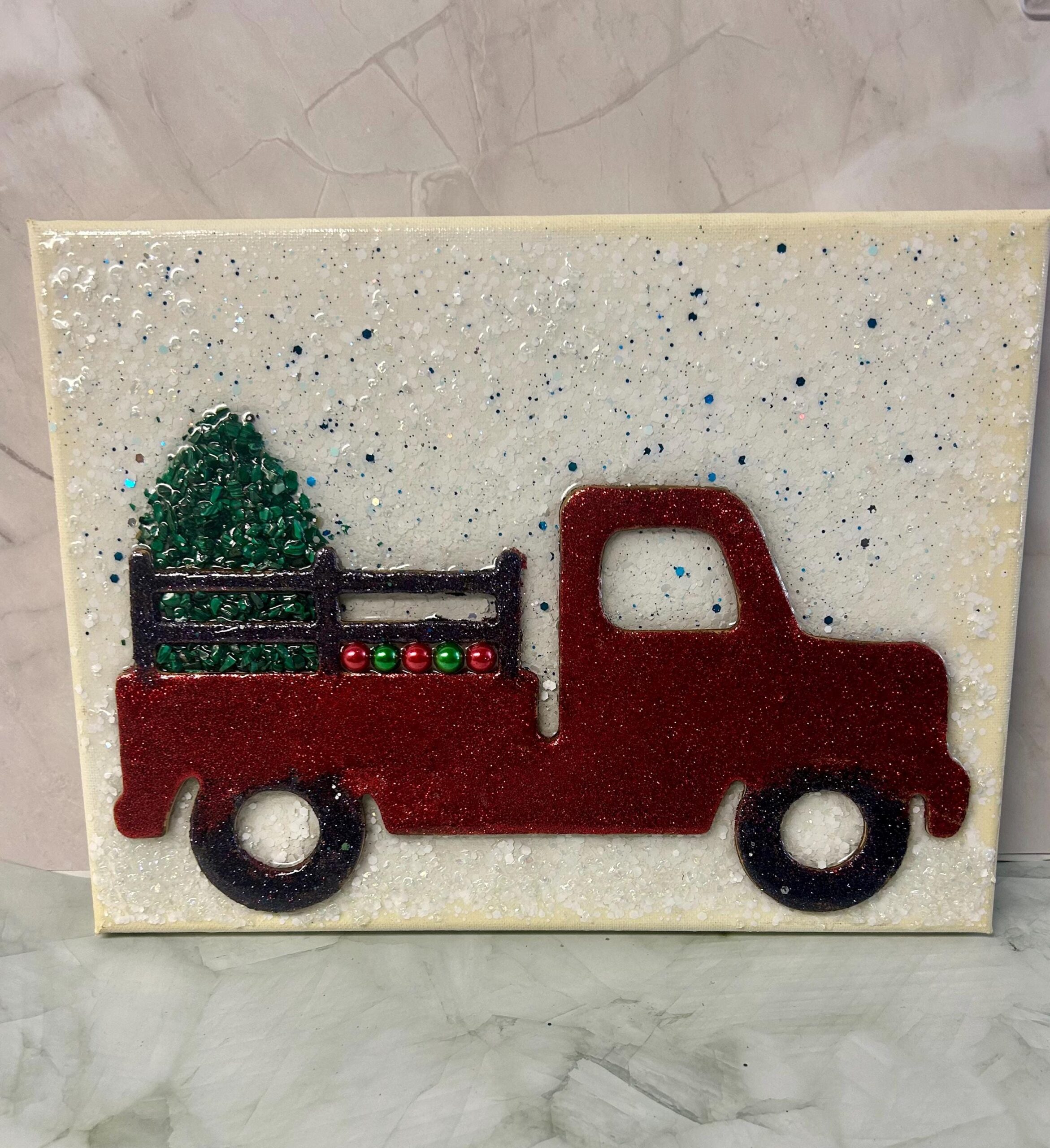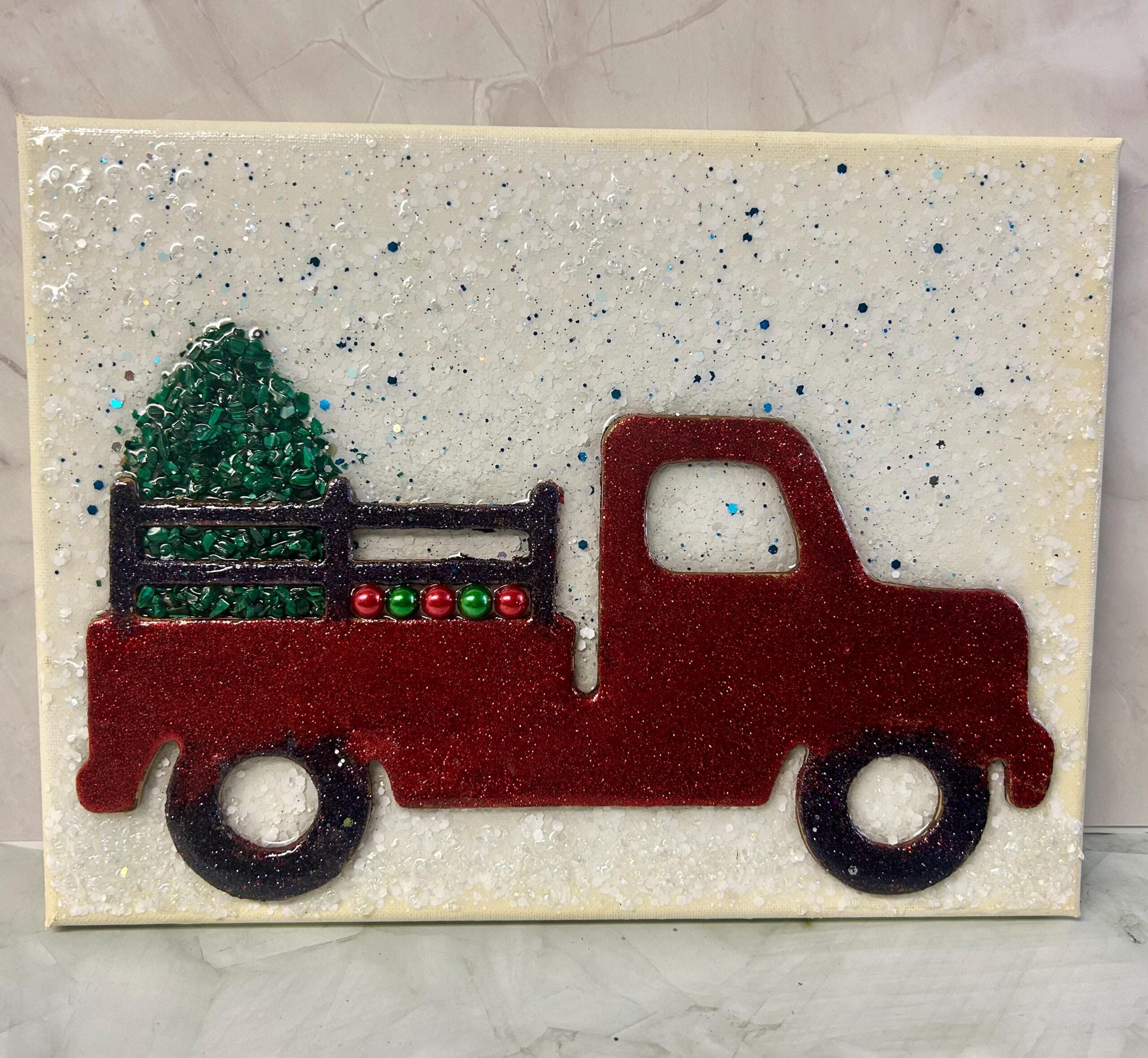 Celebrate the holiday season with this festive handmade resin canvas featuring a classic red truck carrying a lush green Christmas tree. The 3D resin design adds depth and texture, bringing the charming scene to life. Rich colors and fine detailing make this piece a standout addition to your seasonal décor.