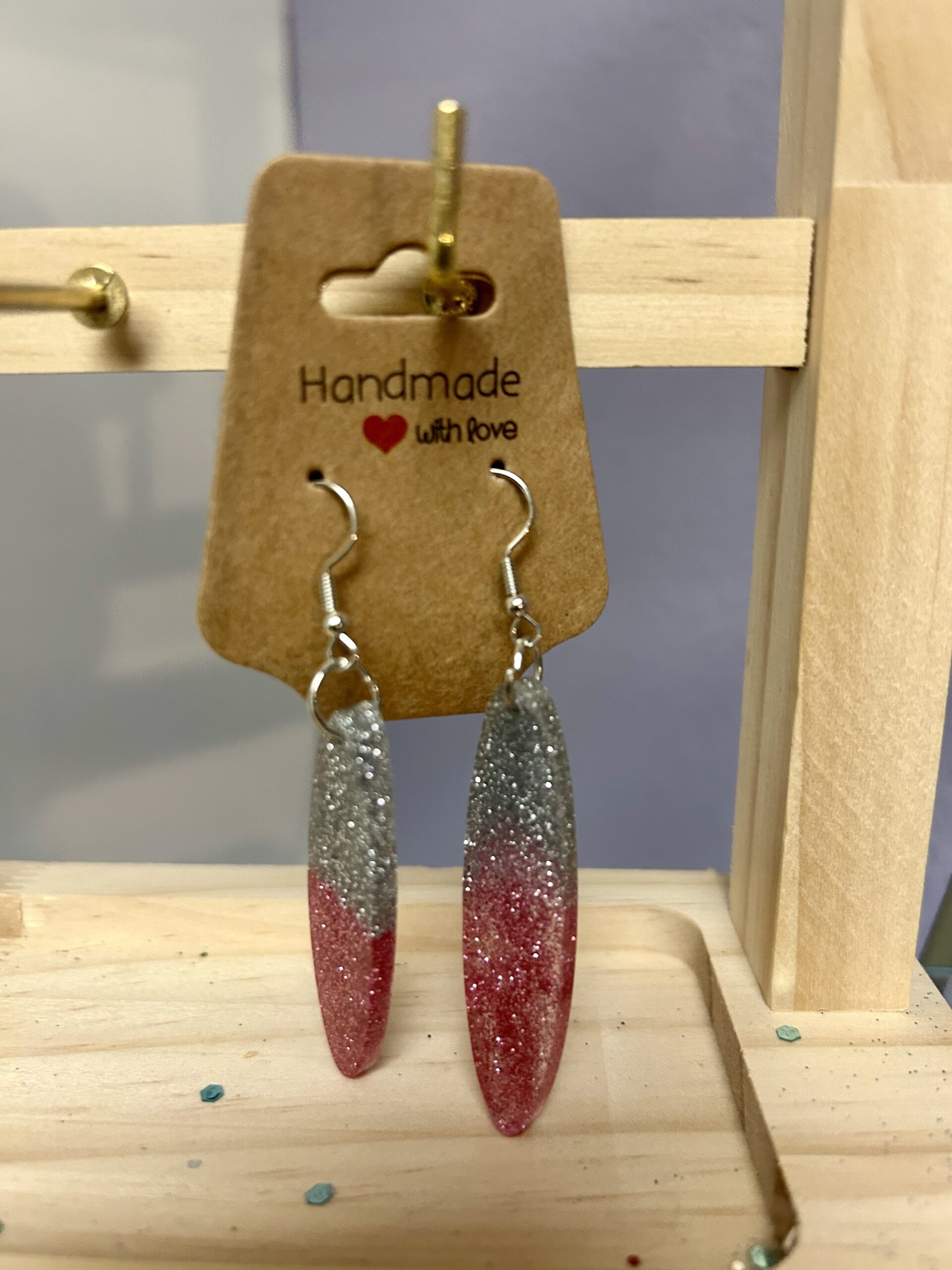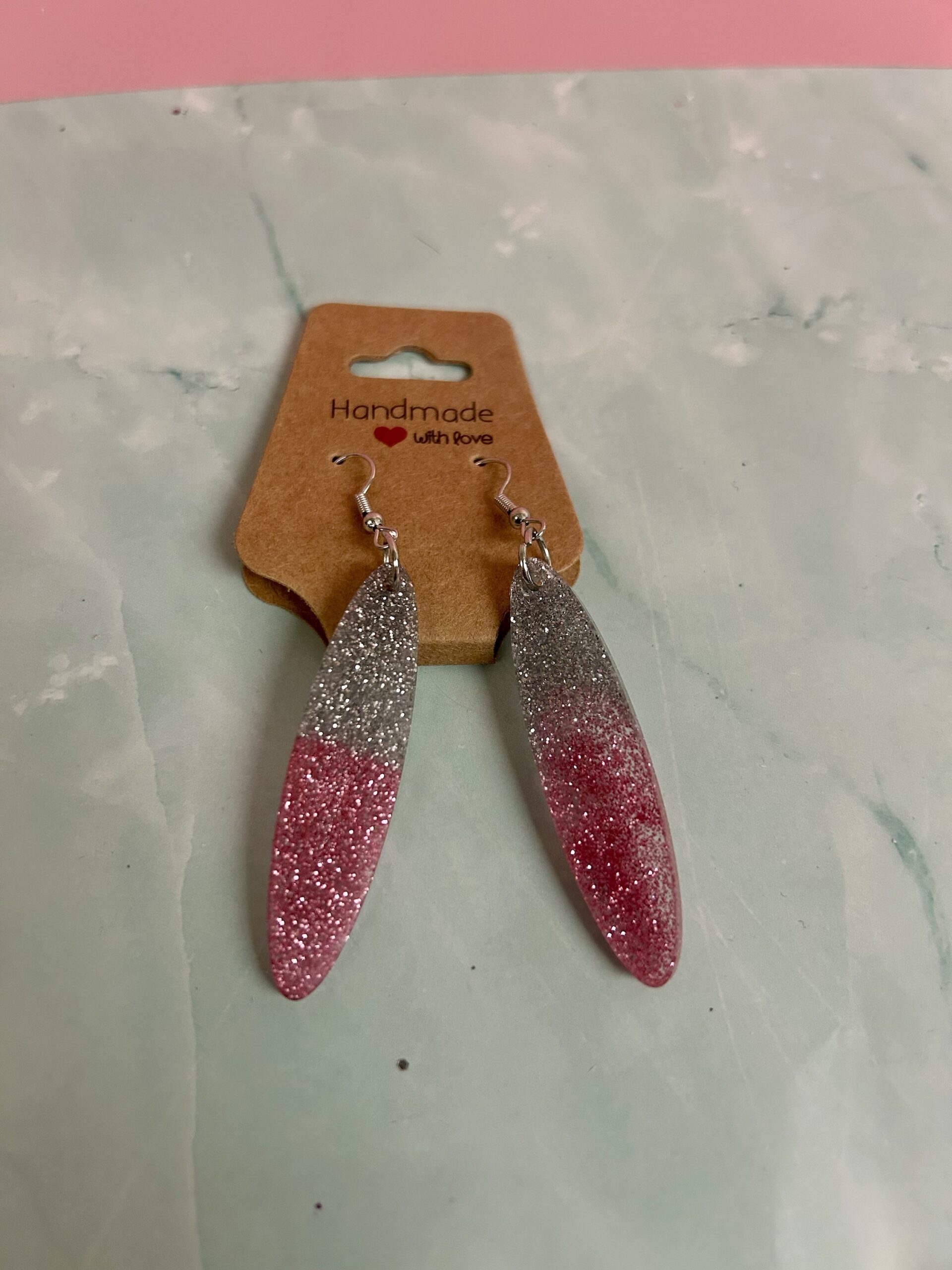 These handmade resin earrings feature a sleek, elongated drop shape with a gorgeous glitter fade that catches the light beautifully. Lightweight and comfortable for all-day wear, they’re perfect for dressing up a casual outfit or adding a fun pop of shine to a night out. Each pair is carefully handcrafted, making every set truly one of a kind.