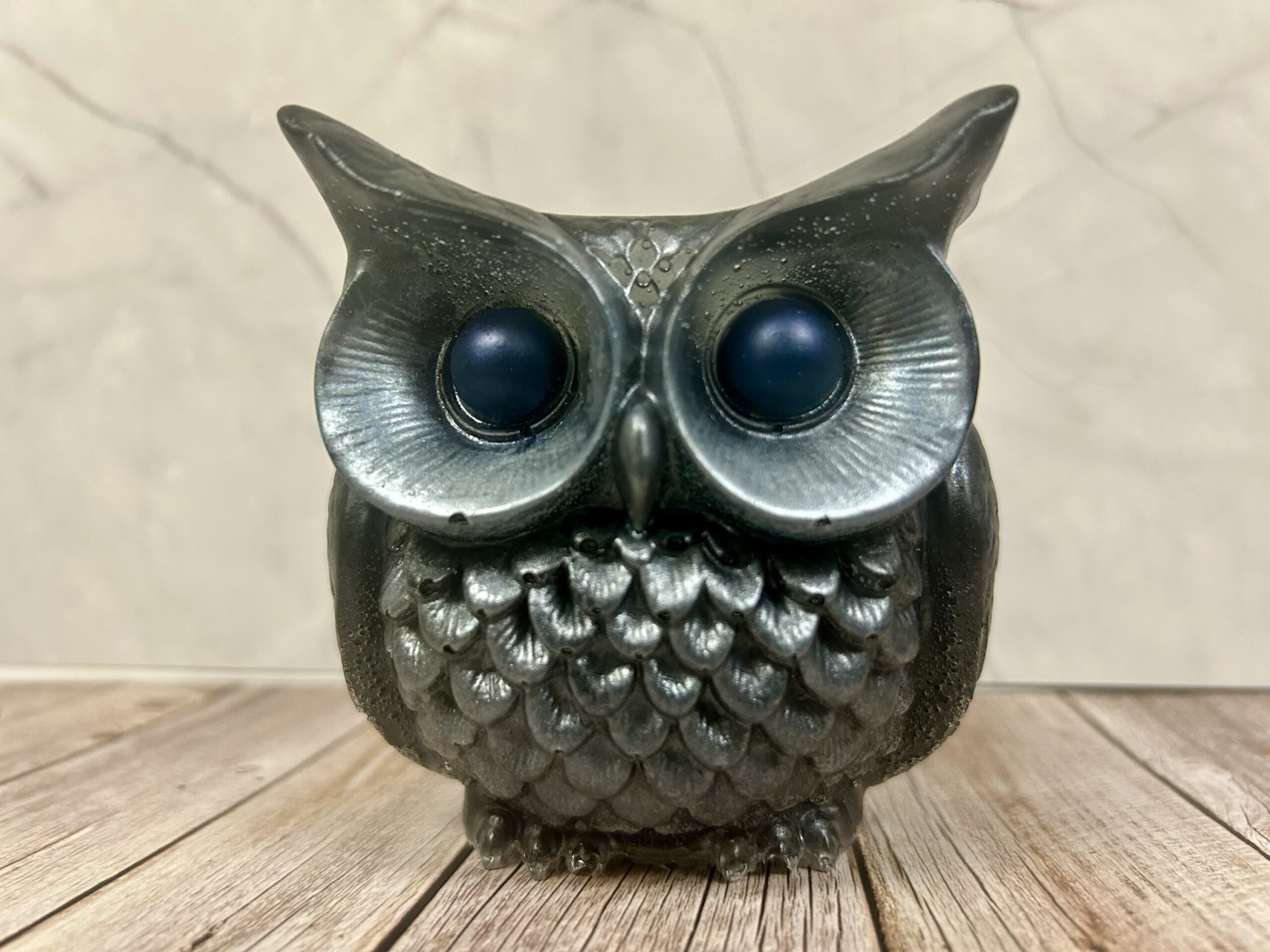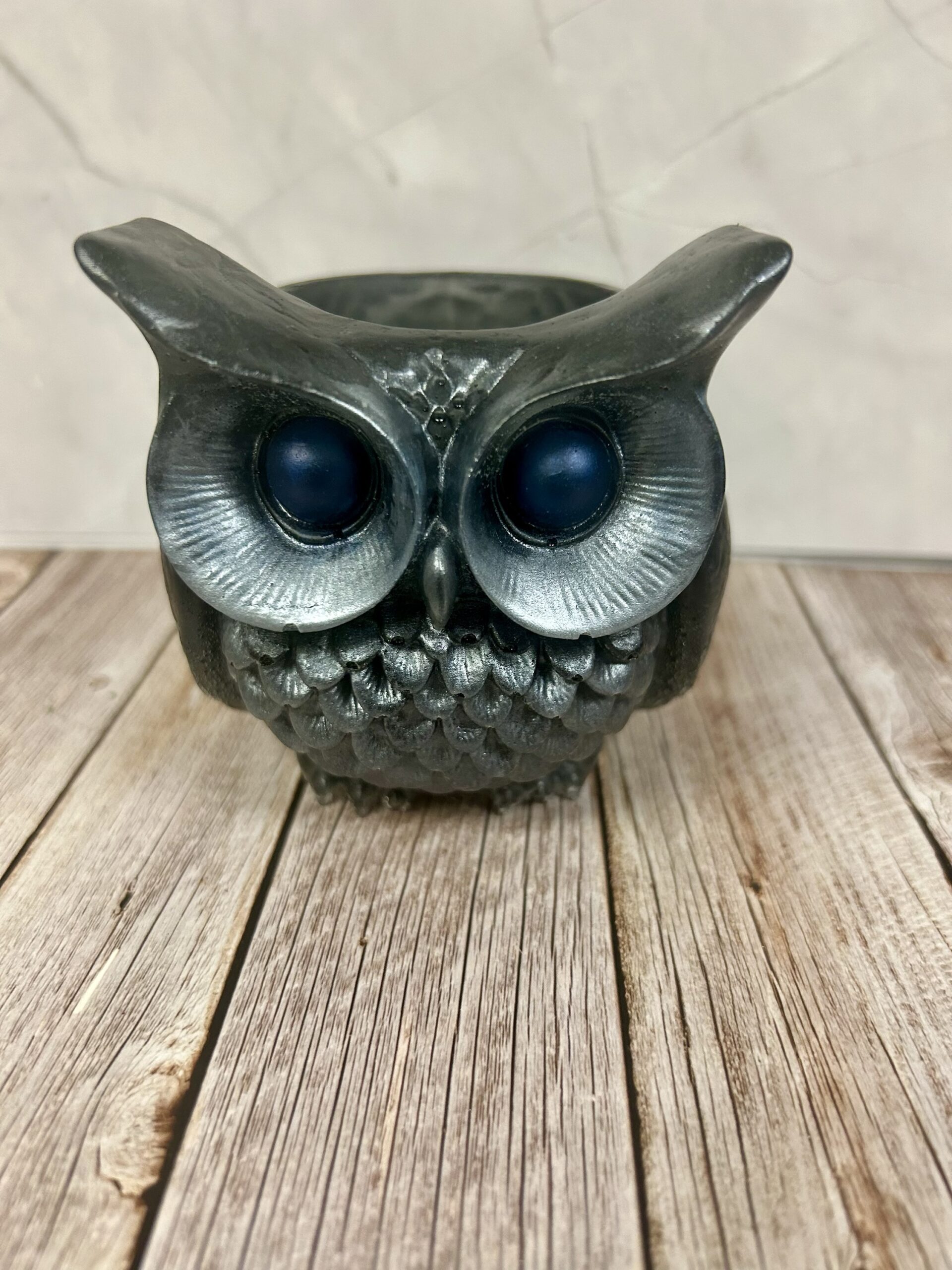 Bring a little wisdom and whimsy to your space with this handmade resin owl figurine. Standing approximately 3 inches high, this charming gray owl features striking blue eyes and a clever hollow design, allowing you to tuck small treasures inside. Perfect for holding tiny trinkets, crystals, notes, or keepsakes, it’s as functional as it is adorable.