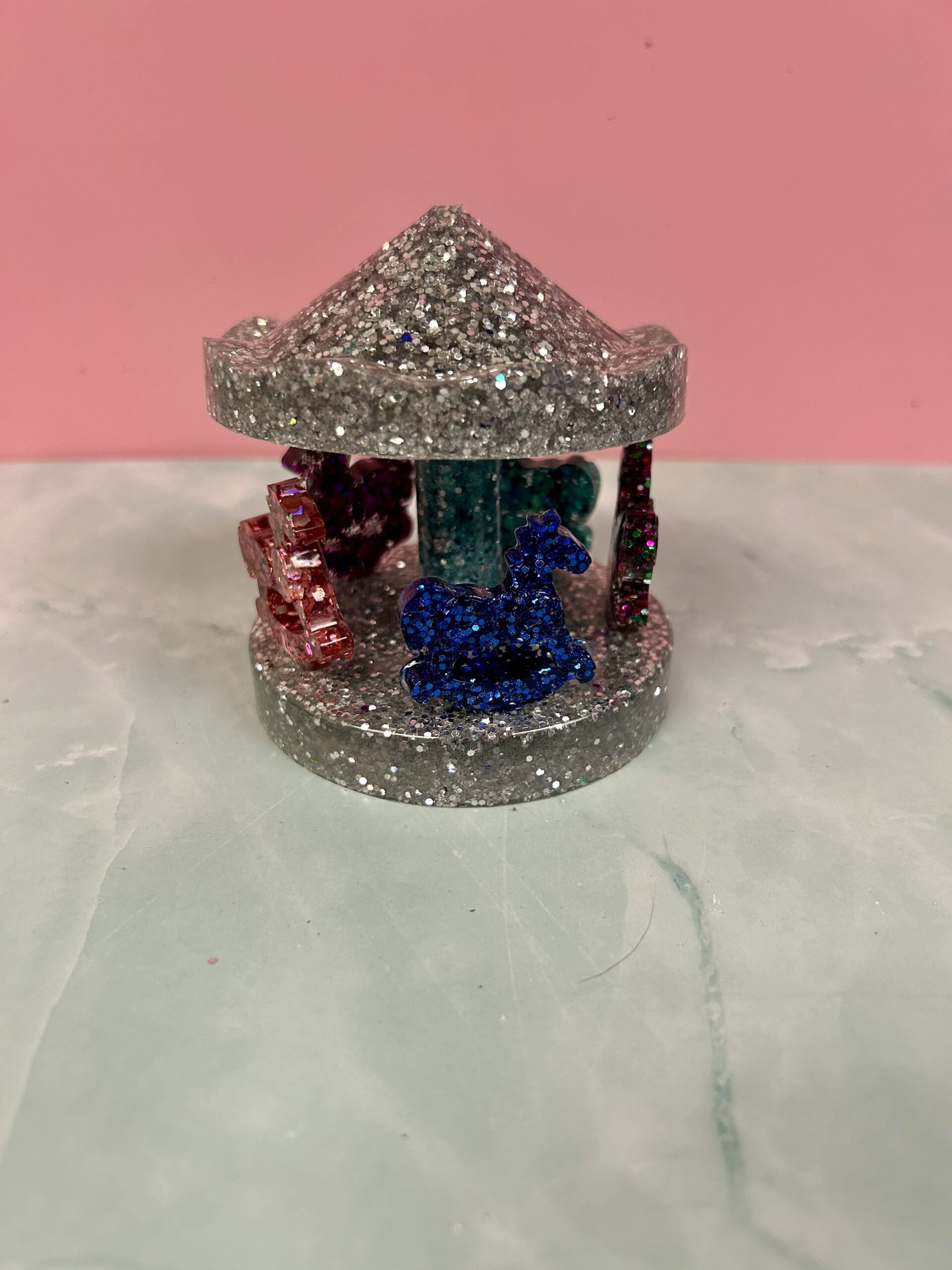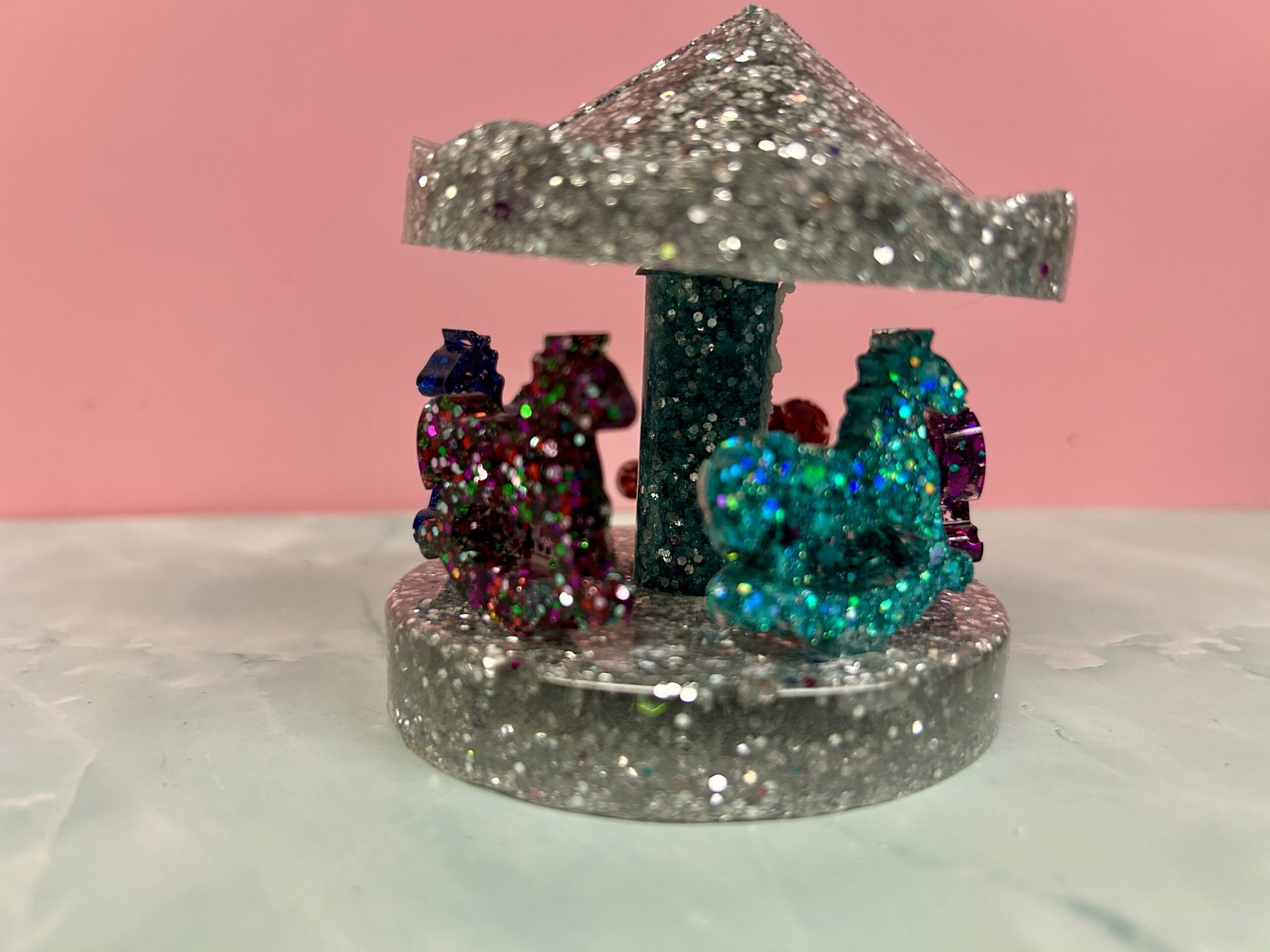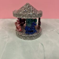 Bring a touch of whimsy and sparkle to any space with this charming handmade resin miniature carousel. Carefully crafted and finished with shimmering glitter details, this tiny carousel captures the magic of a classic fairground ride in a delightful, display-ready size. Each piece is individually made, giving it its own unique character and shine.