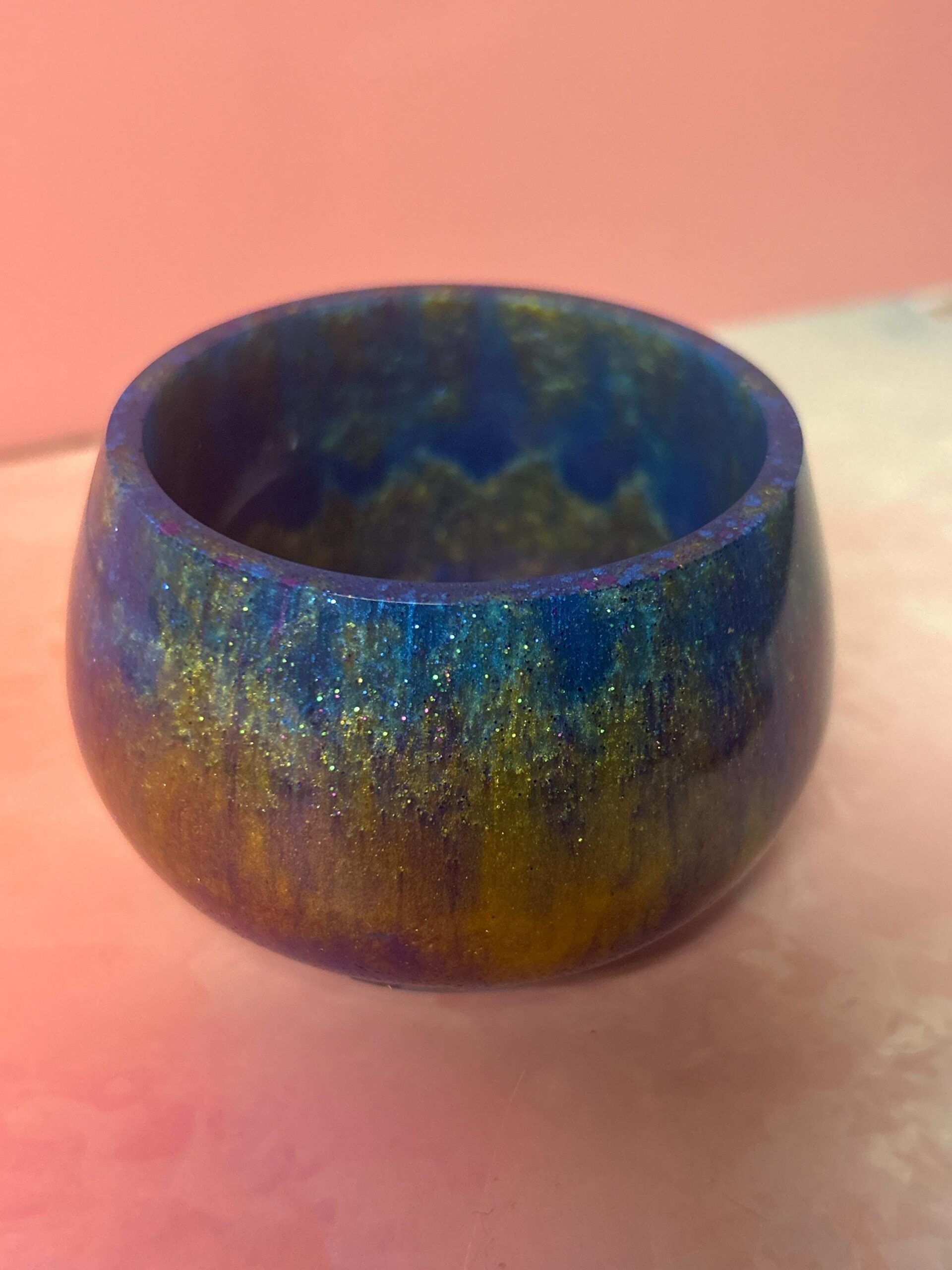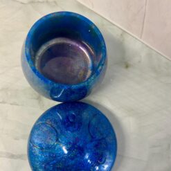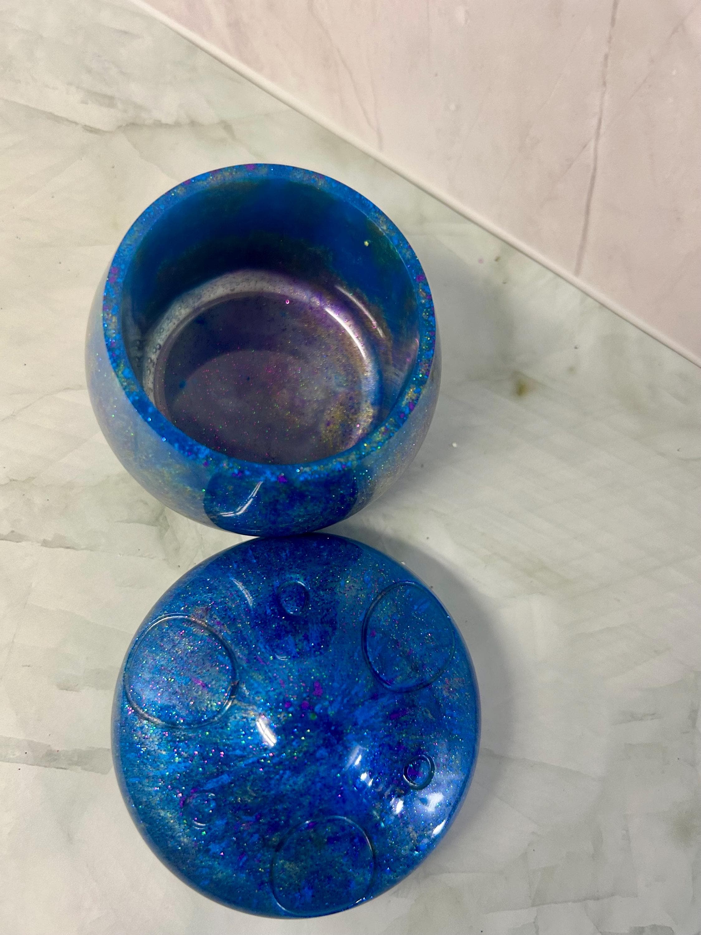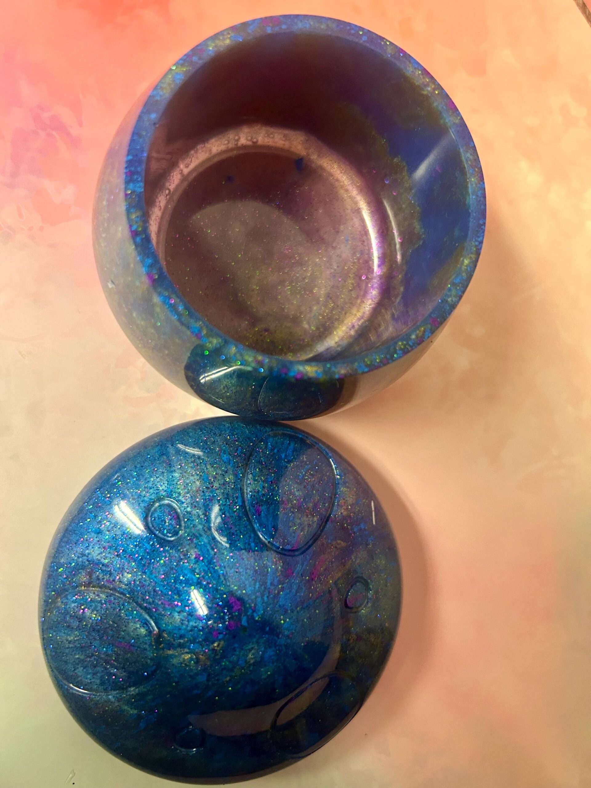 Small Hand made resin trinket jewelry dish with lid. Multi colors: blue purple gold etc