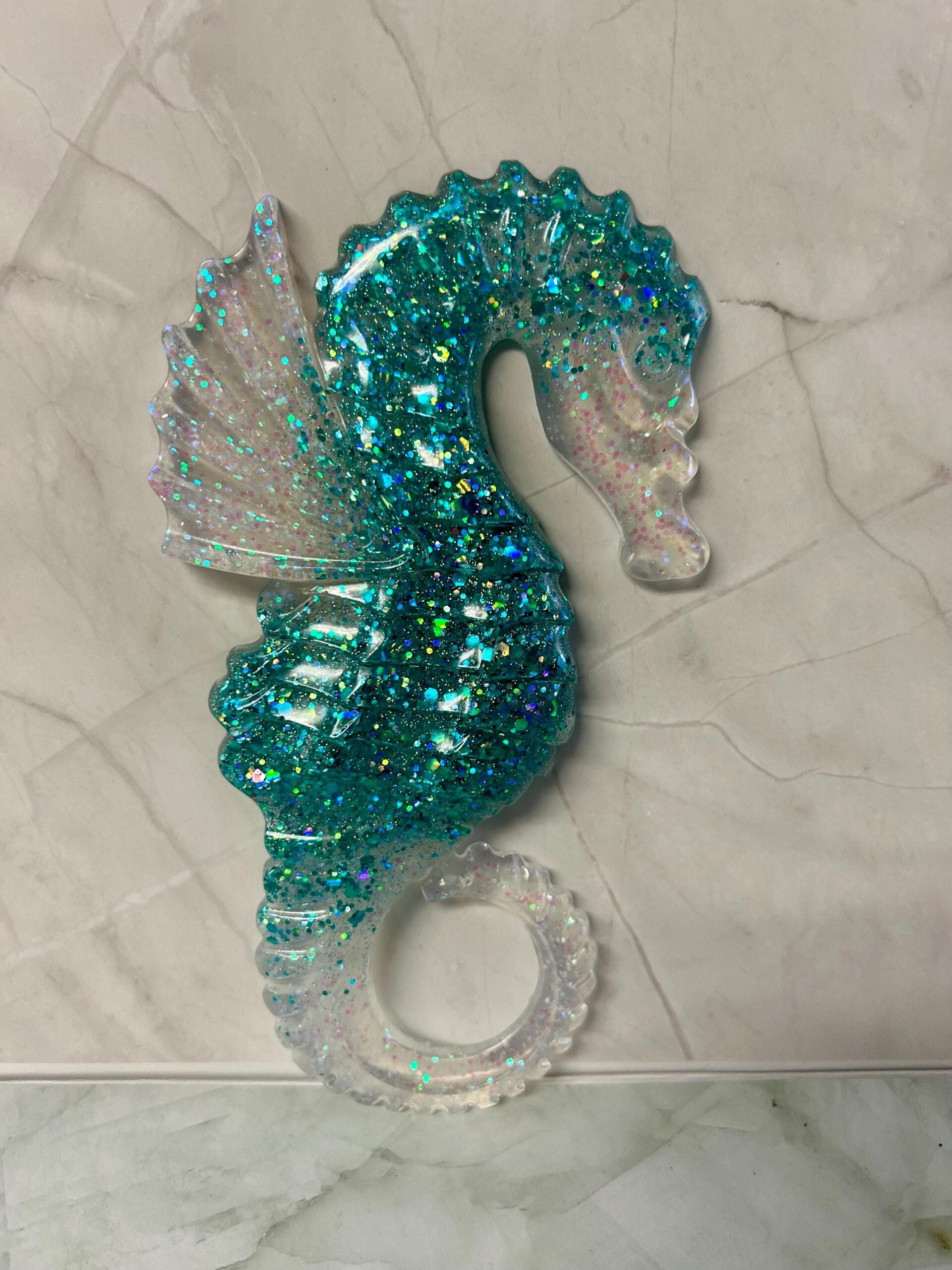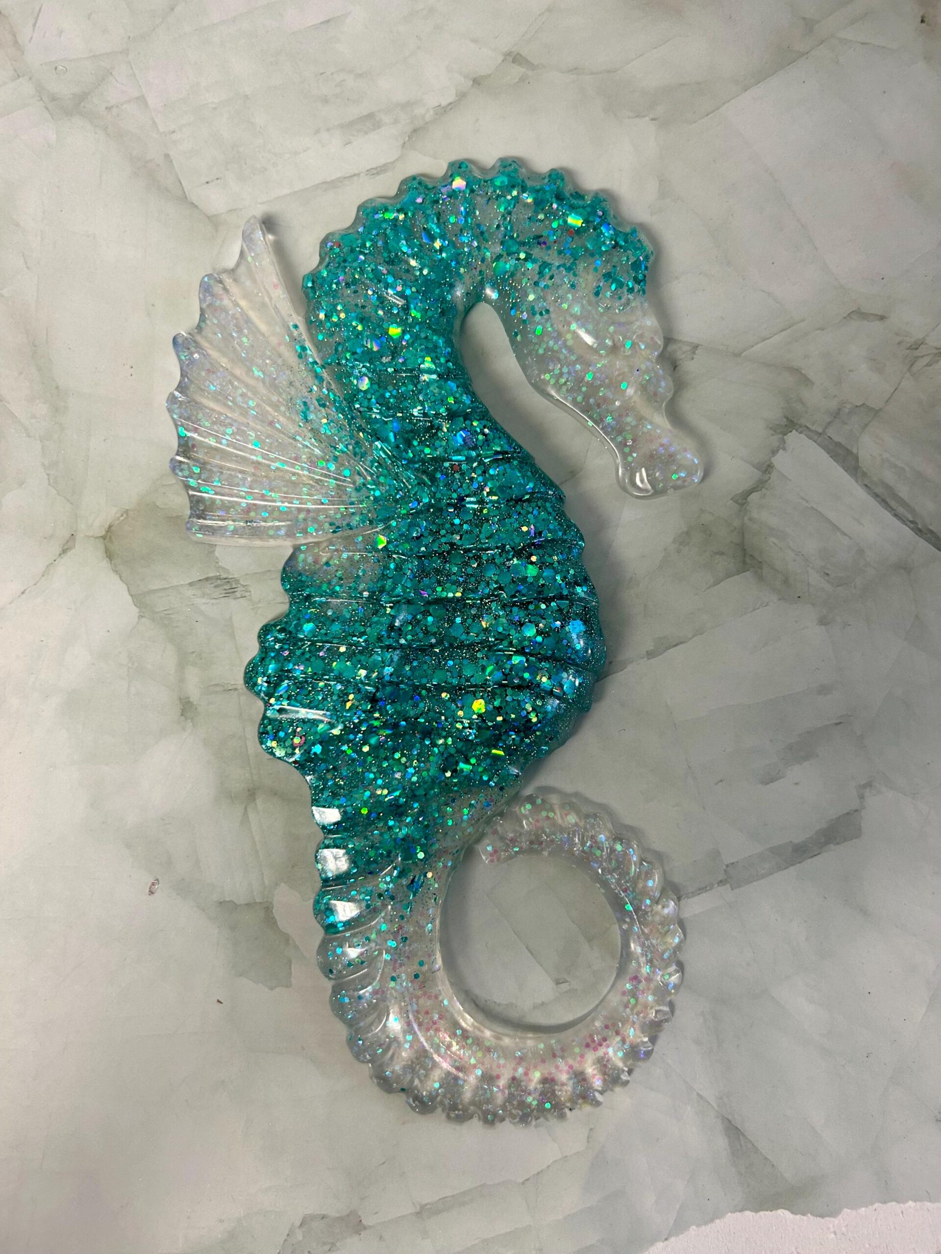 Bring a touch of ocean magic into your home with this stunning handmade resin seahorse! Standing at approximately 7 inches tall, each piece is carefully crafted by hand, featuring intricate details and shimmering effects that capture the beauty of the sea. The example shown sparkles with layers of glittery aqua and iridescent tones, but your seahorse can be completely customized to match your style.
