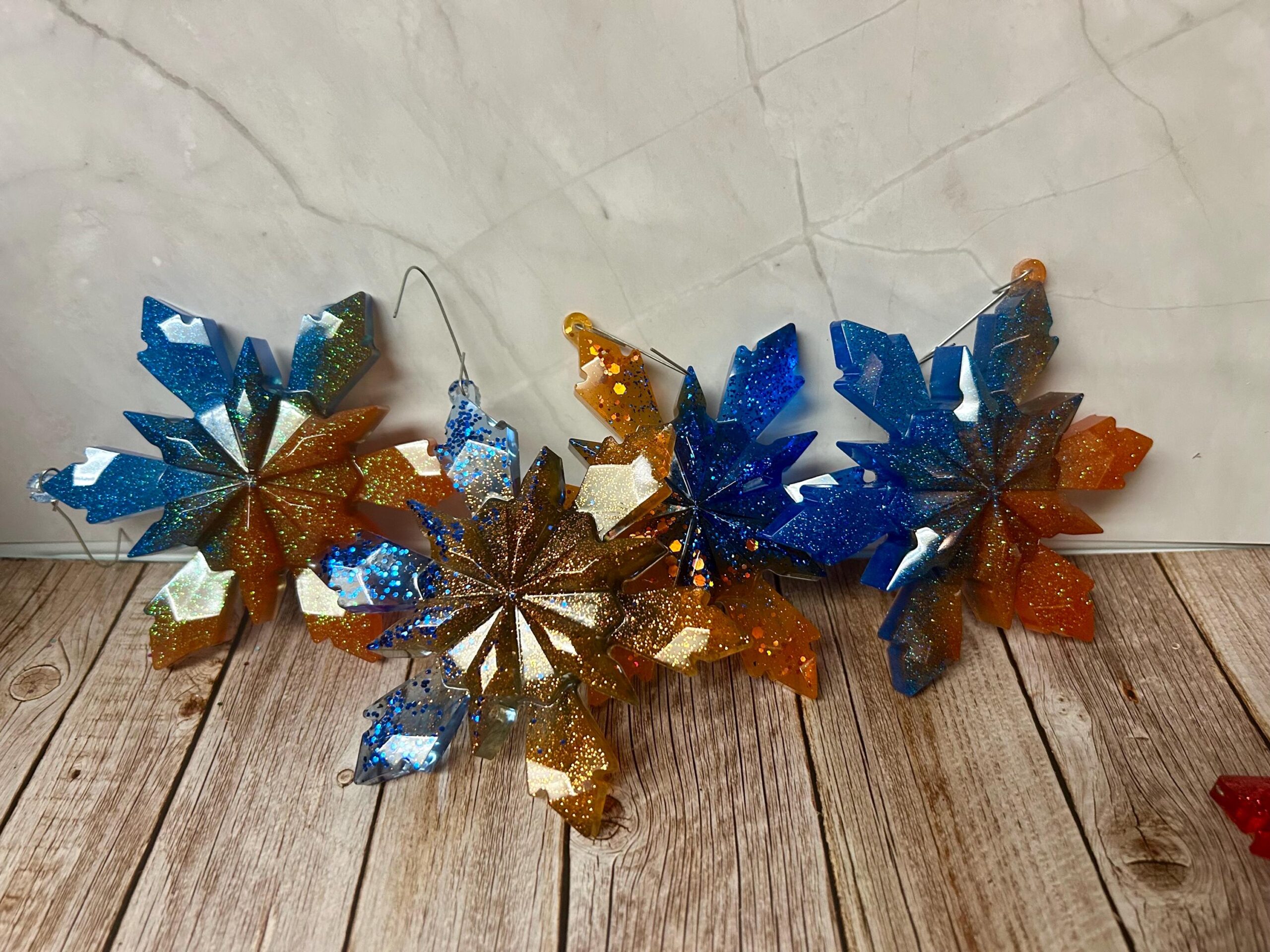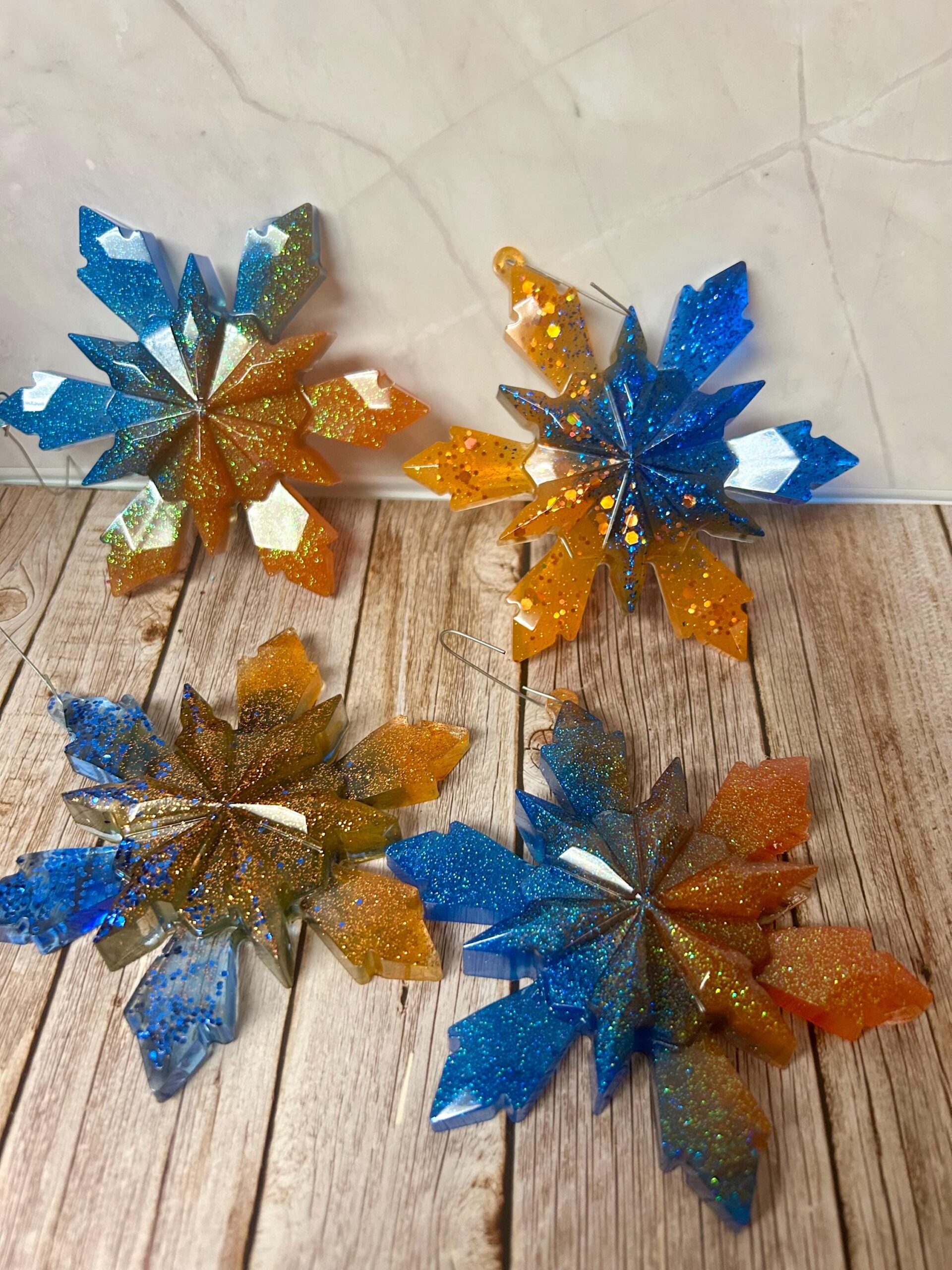 Add a touch of winter magic to your décor with this set of four handmade blue and orange snowflake ornaments. Each snowflake is carefully crafted by hand, making every piece truly one of a kind. The vibrant blend of cool blue and warm orange creates a striking contrast that sparkles beautifully in holiday lights and stands out on any tree or seasonal display.